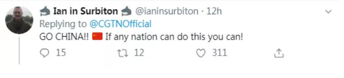 “如果有任何一個國家可以做到,那就是你們了!中國加油啊!”