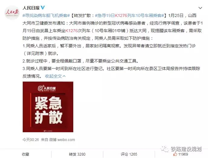 1月25日,山西大同市衛健委發布通知:大同市首例確診的新型冠狀病毒感染患者,經流行病學調查,該患者于1月19日由武昌上車乘坐K1276次列車(10號車廂01中鋪)抵達大同,現提醒該車廂乘客,需采取防護措施,并按傳染病防治有關規定,同乘人員需采取如下防護措施: 1、同乘人員返家后,暫不要外出,居家封閉隔離觀察。發現異常者請立即就近到指定發熱門診(詳見附表)就診。 2、就診過程中,要全程佩戴口罩,盡量不要乘坐公共交通工具。 3、同乘人員要第一時間到所在社區進行登記。社區要第一時間向所在縣區衛體局報告并持續跟蹤反饋情況。