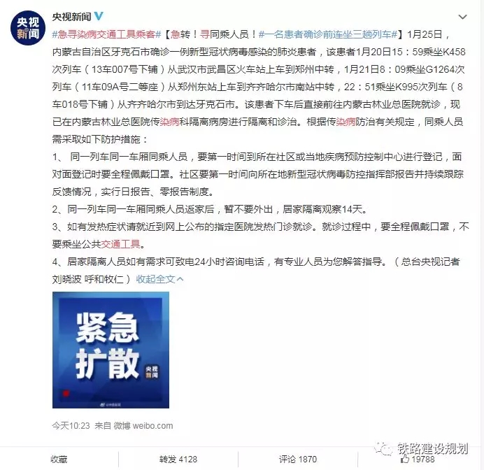 1月25日,內蒙古自治區牙克石市確診一例新型冠狀病毒感染的肺炎患者,該患者1月20日15:59乘坐K458次列車(13車007號下鋪)從武漢市武昌區火車站上車到鄭州中轉,1月21日8:09乘坐G1264次列車(11車09A號二等座)從鄭州東站上車到齊齊哈爾市南站中轉,22:51乘坐K995次列車(8車018號下鋪)從齊齊哈爾市到達牙克石市。該患者下車后直接前往內蒙古林業總醫院就診,現已在內蒙古林業總醫院傳染病科隔離病房進行隔離和診治。根據傳染病防治有關規定,同乘人員需采取如下防護措施: 1、 同一列車同一車廂同乘人員,要第一時間到所在社區或當地疾病預防控制中心進行登記,面對面登記時要全程佩戴口罩。社區要第一時間向所在地新型冠狀病毒防控指揮部報告并持續跟蹤反饋情況,實行日報告、零報告制度。 2、同一列車同一車廂同乘人員返家后,暫不要外出,居家隔離觀察14天。 3、如有發熱癥狀請就近到網上公布的指定醫院發熱門診就診。就診過程中,要全程佩戴口罩,不要乘坐公共交通工具。