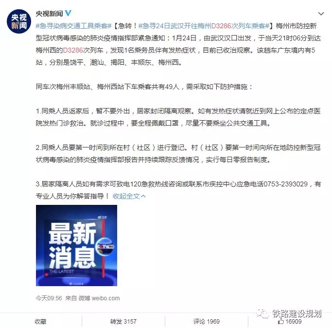 梅州市防控新型冠狀病毒感染的肺炎疫情指揮部緊急通知:1月24日,由武漢漢口出發,于當天21時06分到達梅州西的D3286次列車,發現1名乘務員伴有發熱癥狀,目前已收治觀察。該趟車廣東境內有5站,分別是饒平、潮汕、揭陽、豐順東、梅州西。同車次梅州豐順站、梅州西站下車乘客共有49人,需采取如下防護措施: 1、同乘人員返家后,暫不要外出,居家封閉隔離觀察。如有發熱癥狀請就近到網上公布的定點醫院發熱門診救治。就診過程中,要全程佩戴口罩,盡量不要乘坐公共交通工具。 2、同乘人員要第一時間到所在村(社區)進行登記。村(社區)要第一時間向所在地防控新型冠狀病毒感染的肺炎疫情指揮部報告并持續跟蹤反饋情況,實行每日零報告制度。 3、居家隔離人員如有需求可致電120急救熱線咨詢或聯系市疾控中心應急電話0753-2393029,有專業人員為你解答指導!