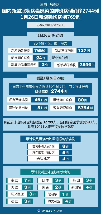 截至1月26日24時,國家衛(wèi)生健康委員會收到30個省(區(qū)、市)累計報告確診病例2744例,現(xiàn)有重癥病例461例,累計死亡病例80例,累計治愈出院51例。現(xiàn)有疑似病例5794例。