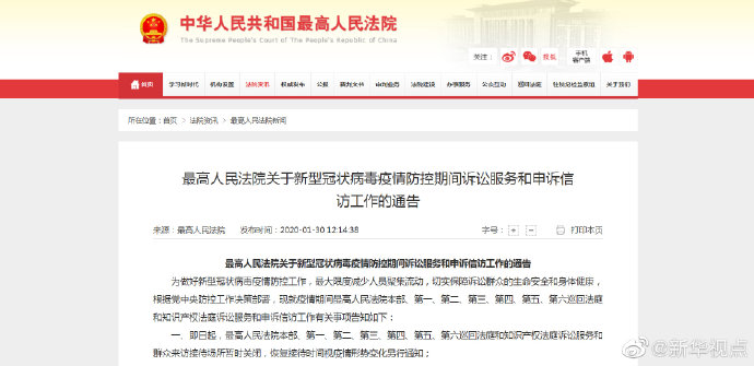 最高人民法院30日發(fā)布通告,即日起,最高人民法院本部、第一、第二、第三、第四、第五、第六巡回法庭和知識(shí)產(chǎn)權(quán)法庭訴訟服務(wù)和群眾來訪接待場所暫時(shí)關(guān)閉,恢復(fù)接待時(shí)間視疫情形勢變化另行通知;當(dāng)事人需要提交申請?jiān)賹彶牧稀⑸暝V信訪或者申請其他訴訟服務(wù)事項(xiàng)的,請通過最高人民法院訴訟服務(wù)網(wǎng)或者郵寄方式提交,查詢咨詢事項(xiàng)可撥打12368訴訟服務(wù)熱線聯(lián)系辦理。(記者羅沙)?
