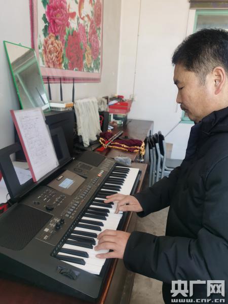 崔建存彈電子琴,琴架上有他從網(wǎng)上自己手抄的20多頁歌曲簡譜(央廣記者 柴華 攝)