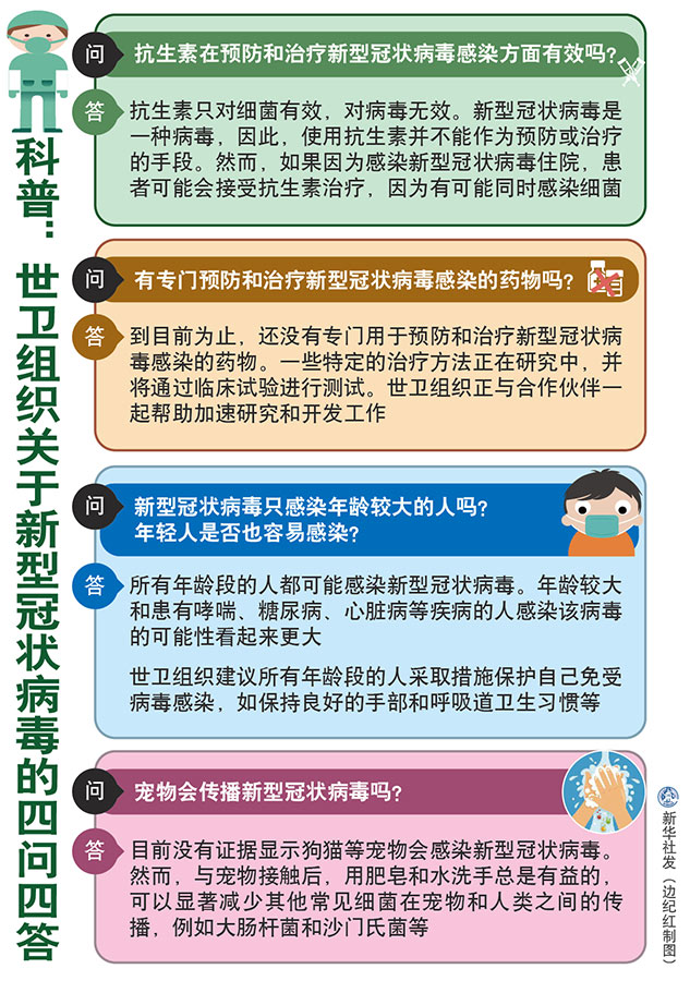 新華社北京2月2日電 面對當前新型冠狀病毒感染肺炎疫情,世界衛生組織近日在其官方網站,回答了公眾普遍關心的“抗生素在預防和治療新型冠狀病毒感染方面有效嗎”等四個問題。新華社記者梳理如下。