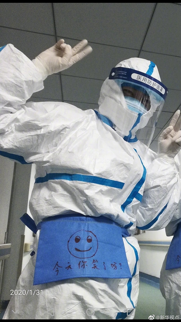 在武漢金銀潭醫院南四病區,由于防護服是連體的,沒有口袋,護士巡視輸液時需要簽名,筆、對講機等小件物品沒地方放,為了工作方便,科室護士的爸爸媽媽親手幫他們做了這個“愛心腰包”,護士長吳靜還在上面畫上了笑臉,鼓勵病人和醫護人員都要樂觀面對。(記者侯文坤、胡喆)