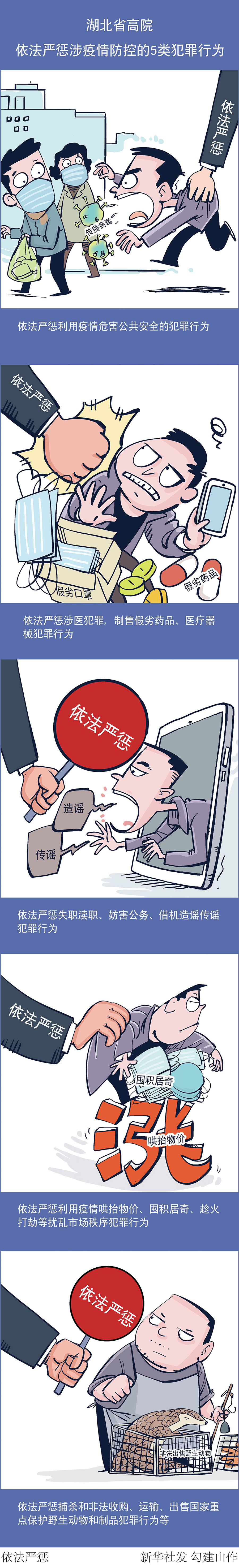 新華社武漢2月5日電(記者梁建強)記者5日從湖北省高級人民法院獲悉,湖北省高院已制訂下發(fā)《關(guān)于充分發(fā)揮審判職能為新型冠狀病毒感染的肺炎疫情防控提供司法保障和服務(wù)的意見》,要求各級法院認(rèn)真落實黨中央、國務(wù)院、最高人民法院和湖北省委、省政府關(guān)于疫情防控相關(guān)決策部署,充分發(fā)揮審判職能作用,切實維護(hù)社會穩(wěn)定,保護(hù)廣大人民群眾的生命健康安全和合法權(quán)益。其中,明確了5類將依法嚴(yán)懲的刑事犯罪類型。