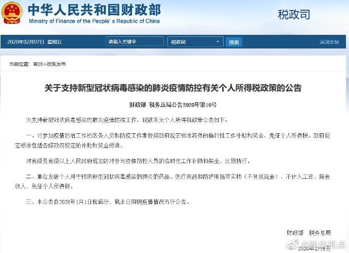 財(cái)政部、國家稅務(wù)總局7日對(duì)外聯(lián)合發(fā)布公告,明確對(duì)參加疫情防治工作的醫(yī)務(wù)人員和防疫工作者按照政府規(guī)定標(biāo)準(zhǔn)取得的臨時(shí)性工作補(bǔ)助和獎(jiǎng)金,免征個(gè)人所得稅。單位發(fā)給個(gè)人用于預(yù)防新型冠狀病毒感染的肺炎的藥品、醫(yī)療用品和防護(hù)用品等實(shí)物(不包括現(xiàn)金),不計(jì)入工資、薪金收入,免征個(gè)人所得稅。(記者劉紅霞、郁瓊源)?