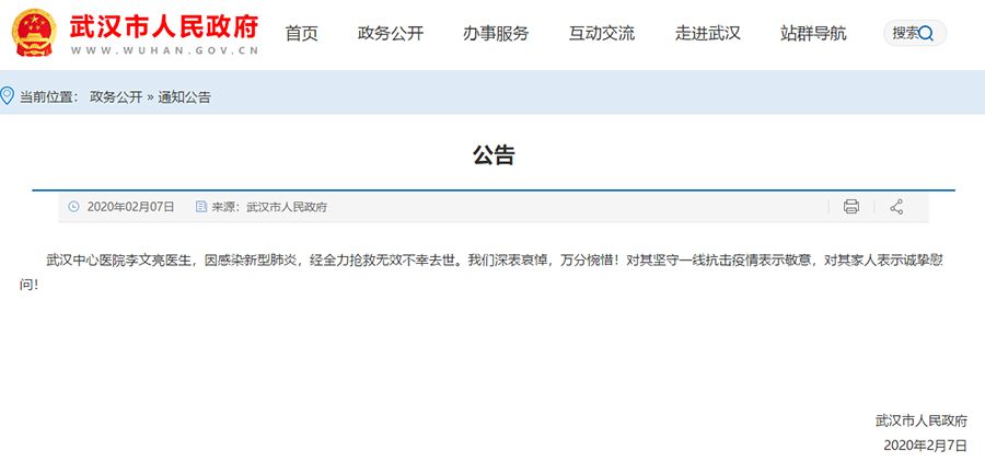 武漢市人民政府:李文亮醫生不幸去世 我們深表哀悼 萬分惋惜