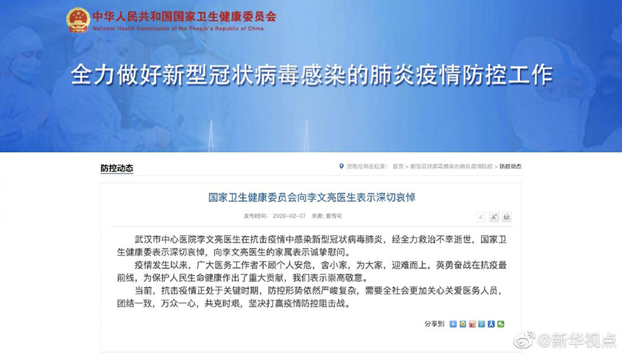 武漢市中心醫(yī)院李文亮醫(yī)生在抗擊疫情中感染新型冠狀病毒肺炎,經(jīng)全力救治不幸逝世,國(guó)家衛(wèi)生健康委表示深切哀悼,向李文亮醫(yī)生的家屬表示誠(chéng)摯慰問(wèn)。