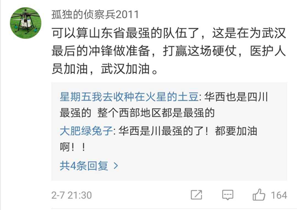 有網(wǎng)友表示,北協(xié)和、南湘雅、東齊魯、西華西,中國醫(yī)療界最頂尖的王炸帶上各省份的天團會師武漢!今天看到最戳心的一句話是:全村的龍已把最硬的麟給你,哪怕自己也傷痕累累,所以,武漢,加油!