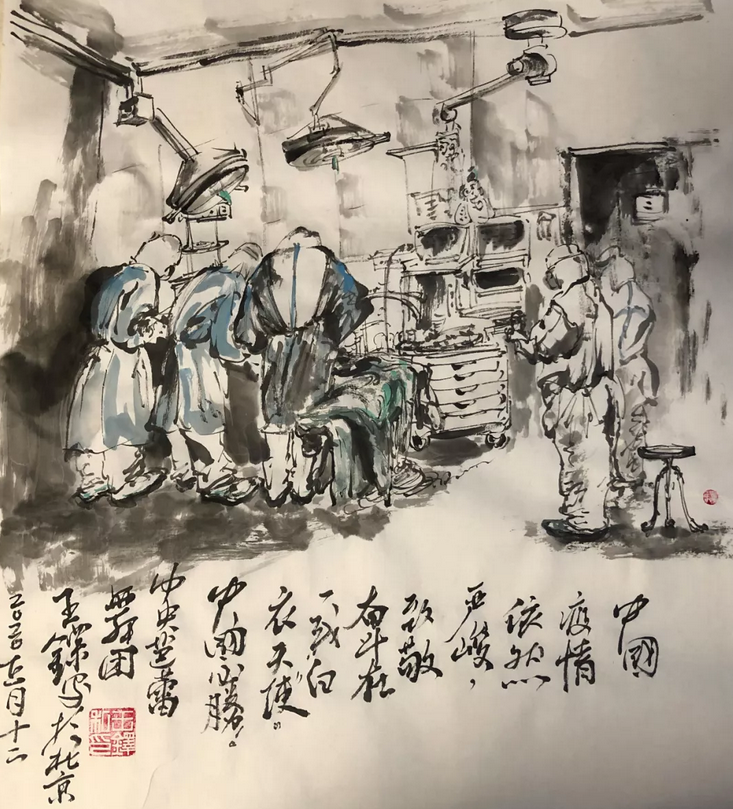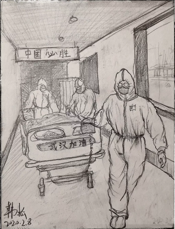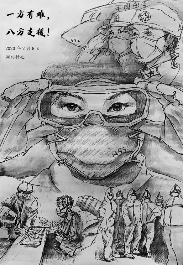 素描畫《一方有難,八方支援!》作者:中央芭蕾舞團燈光設(shè)計 周杉行也