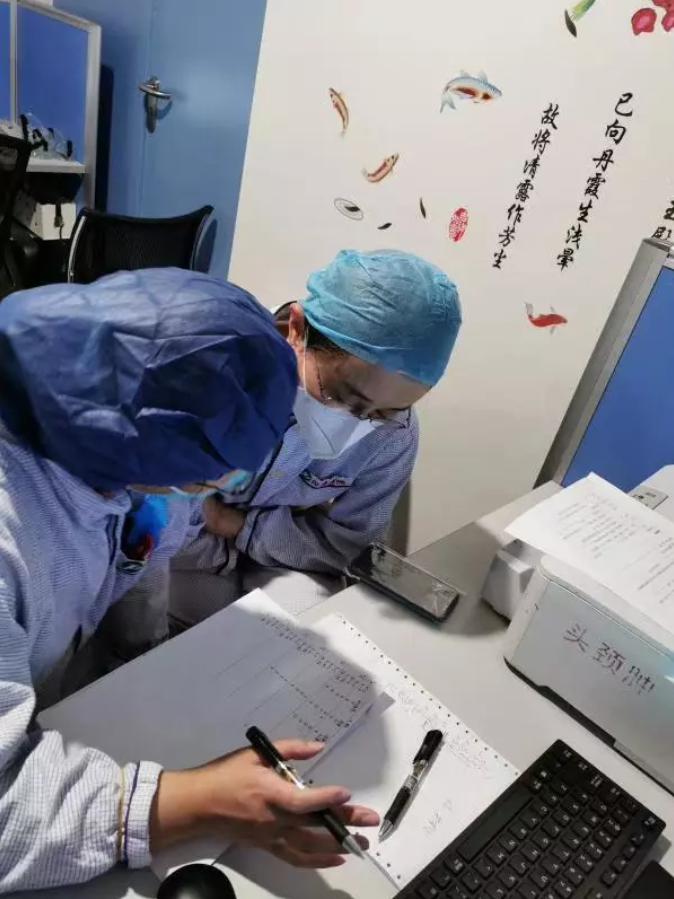 啟用危重癥新病房的第一天,姝姐上了一個“24小時白連夜班”。第一位來診的是個危重患者,姝姐主動請纓:“來,我收這個病人。”凌晨3點,到了該下班的時間,姝姐還在寫病歷,她說污染區(qū)的護士還沒換好衣服,“等她們出來,我再結(jié)束工作,我們一起離開”。而這一等又是一個小時……下午15點到21點又輪到北醫(yī)三院隊員們上崗了,她再次主動請纓參加工作,我有些擔心她的身體會吃不消,本想勸阻一下,誰知她微微一笑說:“你姝姐有啥不行的!”直到22點30,姝姐才從隔離病房出來,口罩和眼罩已經(jīng)壓紅了鼻梁,衣服早已被汗水浸濕了,可她仍然面帶著微笑。