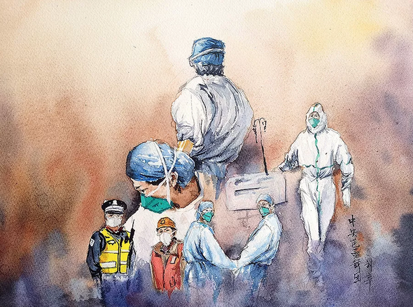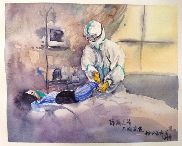 水彩畫《隔離疫情 不隔離愛》作者:中央芭蕾舞團舞美設(shè)計 劉辛