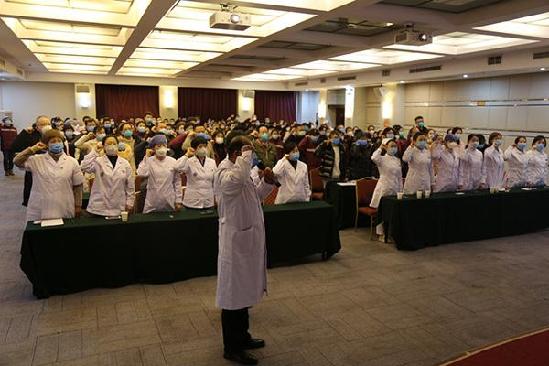 1月27日,在武漢市蔡甸區執行新型冠狀病毒肺炎疫情援助任務的遼寧省醫療隊,成立臨時黨支部,全體醫護人員向黨旗鄭重宣誓,堅決打贏新冠肺炎疫情防控阻擊戰。