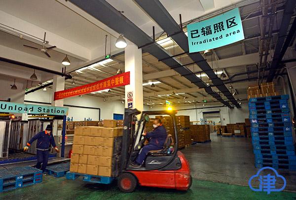下午4點半,記者來到新區的另一家復工企業——天津金鵬源輻照技術有限公司。在輻照車間調度室,生產部兩位值班主任錢寧勇和趙志強正在交班,監控系統屏幕上數據不停跳動,實時顯示每一拖箱貨物輻照殺菌的進程狀態。