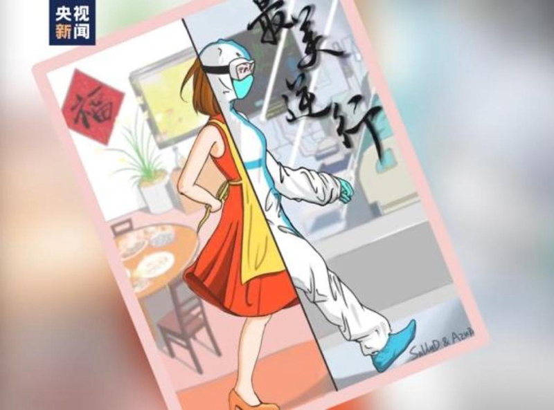 設計師董思喬的母親,是北京大學人民醫院的一名醫務工作者。在董思喬七歲那年,正逢非典暴發,她的母親堅守崗位留在醫院救治患者。十七年后,新冠肺炎來襲,她看到很多醫務工作者也像當年她的母親一樣在最危險的地方戰斗,義無反顧,馳援武漢。于是,她拿出畫筆畫出她心中醫務工作者們最美的樣子:“身后,是飄香的飯菜,是溫馨的家;面前,是防疫一線,是需要救治的患者。逆行者們,愿你們平安歸來。”