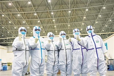 2月10日,在武漢客廳方艙醫院,幾名醫護人員為自己打氣。新華社記者 熊琦攝