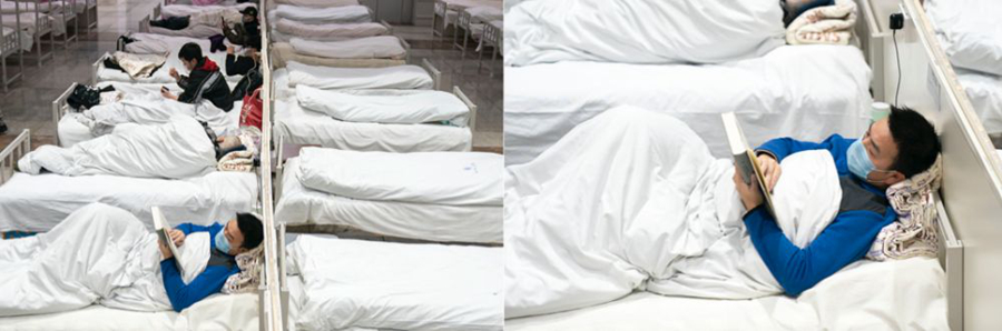 這些身影中還有被隔離的病人。江漢方艙醫院啟用的第一天,收治的首批病人里,有一個面目清秀的小伙子。入院躺下后,他打開了一本《政治秩序的起源》,安靜地閱讀。口罩遮住了他的表情,但卻藏不住眼神里的平靜和專注。看見我舉起相機,他輕輕擺了擺手,示意不用拍他,我猶豫片刻,還是執意按下了快門。也許他并不明白,在有些喧囂的方艙醫院里,近乎靜止的他,是多么的令人震撼。