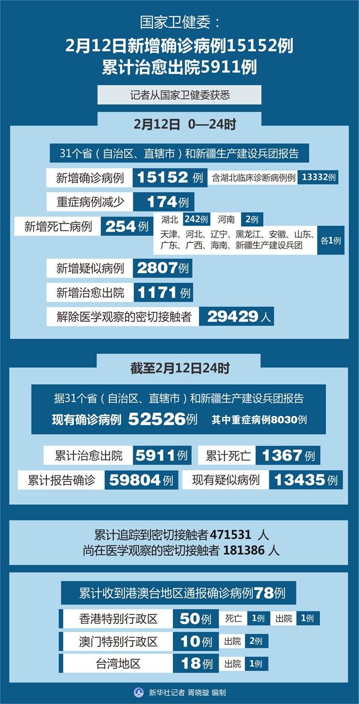 截至2月12日24時,據31個省(自治區、直轄市)和新疆生產建設兵團報告,現有確診病例52526例(其中重癥病例8030例),累計治愈出院病例5911例,累計死亡病例1367例,累計報告確診病例59804例,現有疑似病例13435例。累計追蹤到密切接觸者471531人,尚在醫學觀察的密切接觸者181386人。