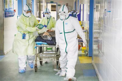 近日,武漢市蔡甸區(qū)人民醫(yī)院醫(yī)護人員在轉(zhuǎn)運新冠肺炎重癥病人。陳 卓攝(影像中國)