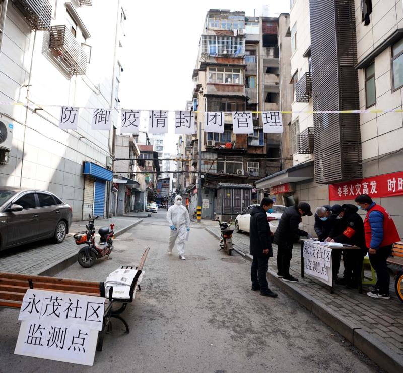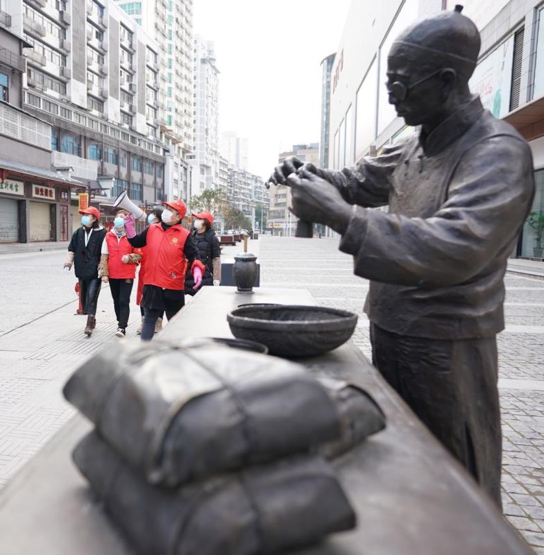 戰“疫”中的漢正街,看不到開門的商戶,很難想像高峰時漢正街的小商品綜合市場曾經有60多個專業市場、30多萬種商品。街頭行人不多,不時能看到街道、社區干部做宣傳或是為居民服務。胡亞非介紹說,漢正街轄區面積1.67平方公里,下轄19個社區。此次疫情開始正值春節之前,10多萬流動人口返鄉,目前常住居民1000余戶,2.6萬多人口。