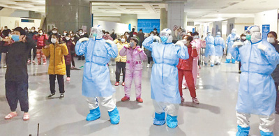 2月12日,武漢國際會展中心方艙醫院,醫護人員和患者一起跳舞。程少文攝(影像中國)