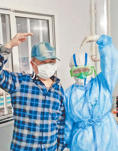 近日,雷神山醫院內醫護人員與患者在一起。高 翔攝(影像中國)