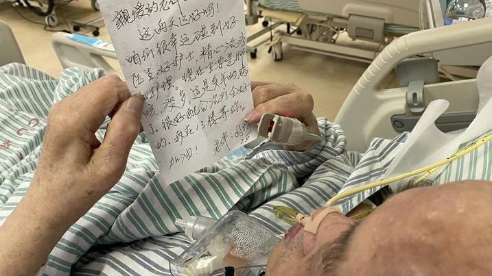 ——“親愛的老伴:這兩天還好嗎!咱們很幸運碰到好醫生、好護士,精心治療和護理。現在主要是肺咳、痰多,這是多年的病了,很好地配合治療就會好的。我在13樓等你。”