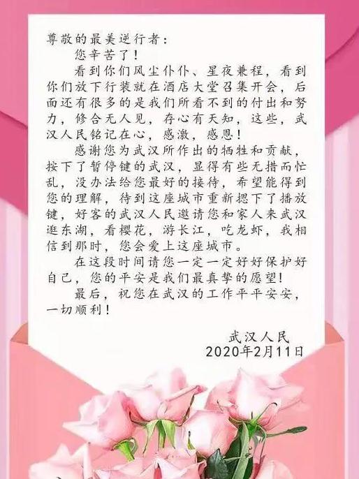 不久,華山醫院醫療隊回復道:這次,武漢人民需要幫助,我們責無旁貸地來了,來幫上一把!大家齊心協力,共渡難關。期待春暖花開,一起逛東湖、看櫻花、游長江、吃龍蝦!