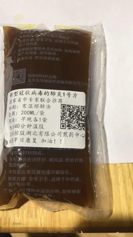每天的診療,醫生給我開的藥有鹽酸阿比多爾片、鹽酸莫西沙星片、磷酸奧司他韋膠囊、蓮花清瘟膠囊和復方甲氧那明膠囊,以及袋裝的中藥肺炎1號方“寒濕郁肺湯”,每袋是200ml。護士會一次發給病人幾天的藥,吃完了再找他們要。有時候護士會提醒你吃藥,但是病人太多了忙不過來,我們病友間就要互相提醒。