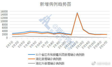 2月17日,31個?。ㄗ灾螀^、直轄市)和新疆生產建設兵團報告新增新冠肺炎確診病例1886例,湖北新增確診病例1807例。這就是說,除湖北外的30個省區市和新疆生產建設兵團昨日新增確診79例,這是自2月3日來新增病例到達高點890例以來的首次兩位數報告,也是第14連降。?