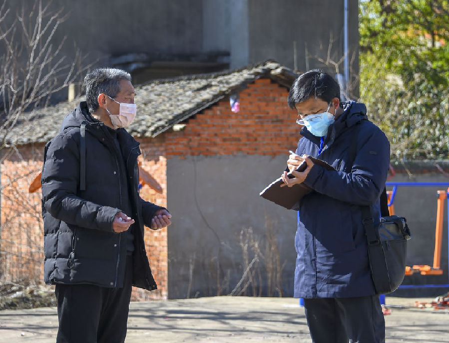 記者伍曉陽(右)在浐川村采訪。新華社記者 胡虎虎 攝