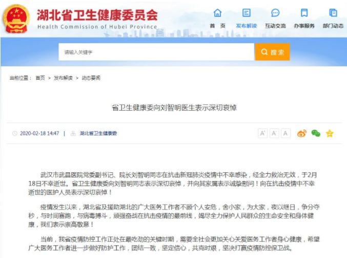 湖北衛健委18日發布通報表示,向劉智明同志表示深切哀悼,并向其家屬表示誠摯慰問。向在抗擊疫情中不幸逝世的醫護人員表示深切哀悼。