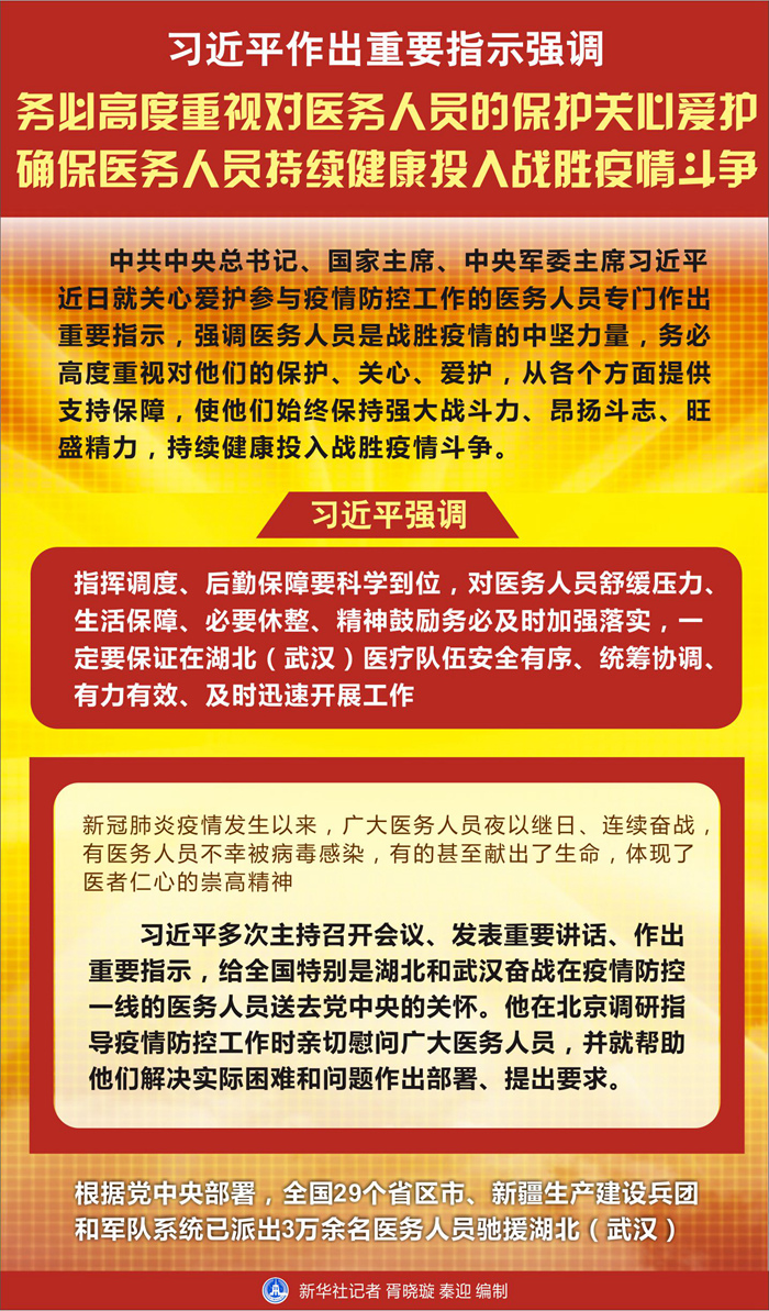 新冠肺炎疫情發生以來,廣大醫務人員夜以繼日、連續奮戰,有醫務人員不幸被病毒感染,有的甚至獻出了生命,體現了醫者仁心的崇高精神。習近平多次主持召開會議、發表重要講話、作出重要指示,給全國特別是湖北和武漢奮戰在疫情防控一線的醫務人員送去黨中央的關懷。他在北京調研指導疫情防控工作時親切慰問廣大醫務人員,并就幫助他們解決實際困難和問題作出部署、提出要求。