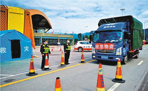 G76廈蓉高速公路桂黔省界疫情監測點(肇興服務區)凱里高速公路管理處路政員為應急物資車輛開啟綠色通道。王 濤攝(中經視覺)