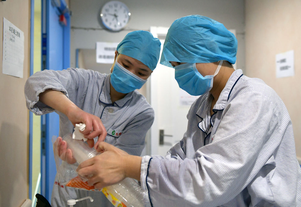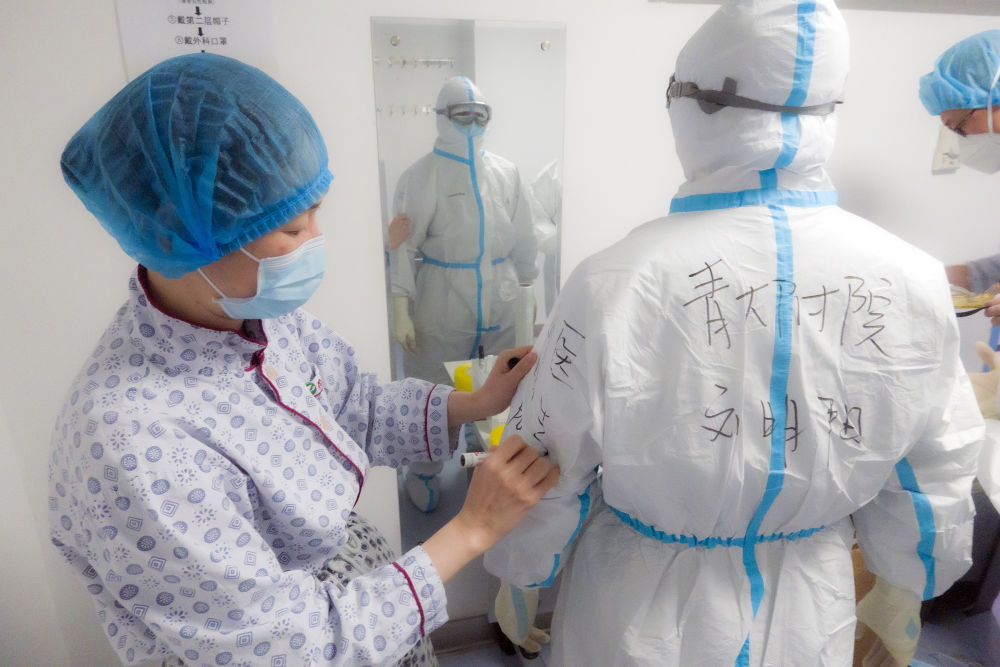 在武漢同濟(jì)醫(yī)院光谷院區(qū),一名青島大學(xué)附屬醫(yī)院醫(yī)療隊(duì)醫(yī)護(hù)人員為同事佩戴面罩。