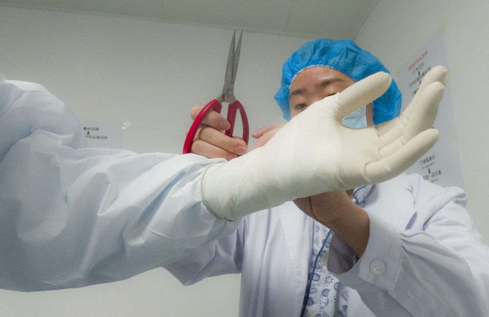 醫(yī)護(hù)人員為同事的手套貼上膠布增加氣密性能。