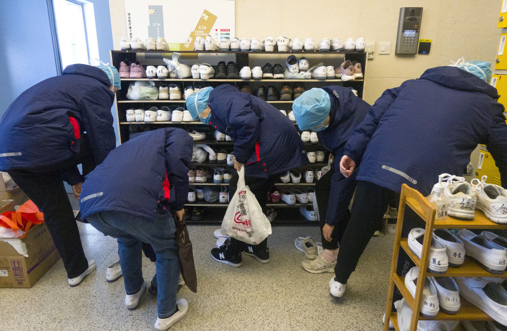 醫(yī)務(wù)人員按規(guī)定將鞋整齊有序地?cái)[放在工作間外。