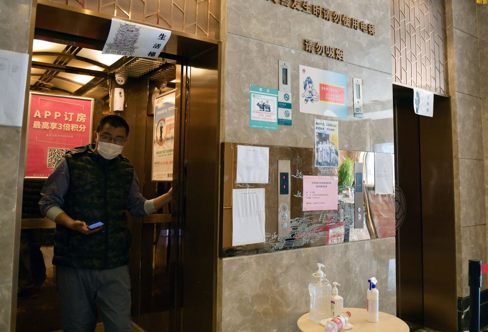 在武漢同濟(jì)醫(yī)院光谷院區(qū),醫(yī)護(hù)人員下班后在乘坐電梯時(shí)所有人都朝向不同方向,期間不說話,減少交叉感染風(fēng)險(xiǎn)。