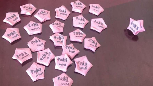 住進(jìn)武漢江夏區(qū)方艙醫(yī)院的輕癥患者不得不與家人隔離,不能出門活動,在初春的戶外仰望星空,暫時只能是一個愿望。2月20日的夜晚,夜班護(hù)士卻把“星星”帶進(jìn)了“方艙”!南京市中西醫(yī)結(jié)合醫(yī)院的護(hù)士王慧敏上班時,向每一位患者贈送了一個自己親手疊的許愿星,每一個“星星”都寫上了祝福的話語:“叔叔阿姨晚上好,這是我自己做的許愿星,祝愿你們早日康復(fù)!”