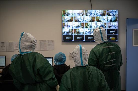 插管前“敢死隊(duì)”隊(duì)員監(jiān)控病房?jī)?nèi)準(zhǔn)備情況。