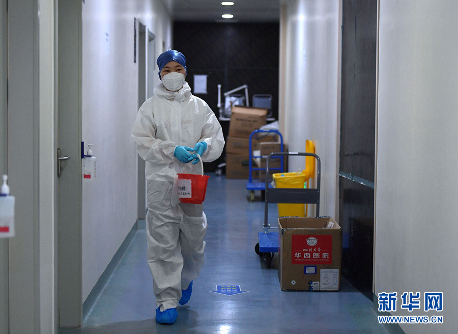 佘沙在湖北省人民醫院東院病區的清潔區打掃防護操作間(2月23日攝)。? 新華社記者李賀攝