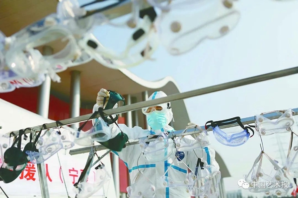 2月22日,武漢市武漢客廳方艙醫(yī)院外,援鄂醫(yī)療隊工作人員清潔護目鏡。 中國攝協(xié)赴湖北抗擊疫情攝影小分隊?李舸 攝