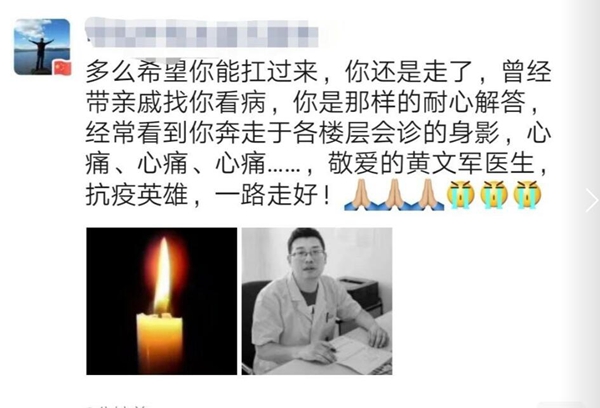 孝感市中心醫(yī)院呼吸內(nèi)科副主任醫(yī)師,中共黨員,優(yōu)秀的白衣戰(zhàn)士黃文軍同志,在抗擊新型冠狀病毒肺炎的戰(zhàn)役中,不幸被感染,經(jīng)多方搶救醫(yī)治無效,于2020年2月23日下午19時30分,不幸犧牲!卒年42歲。