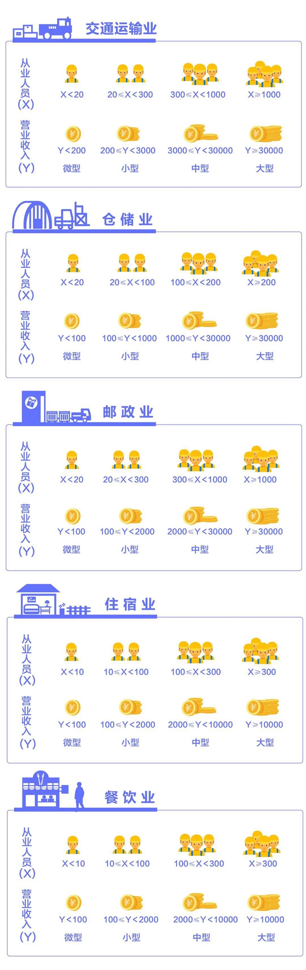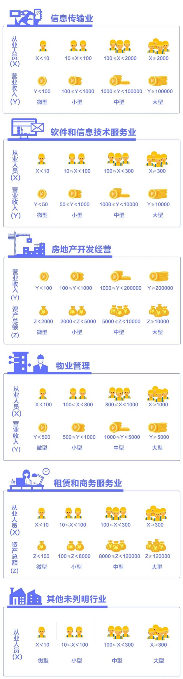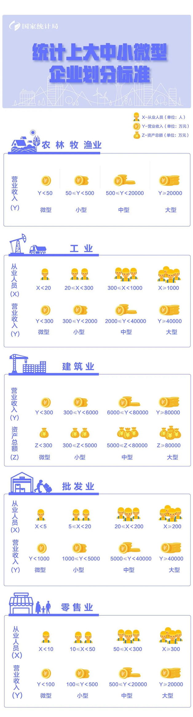 該辦法按照行業門類、大類、中類和組合類別,依據從業人員、營業收入、資產總額等指標或替代指標,將我國的企業劃分為大型、中型、小型、微型等四種類型。