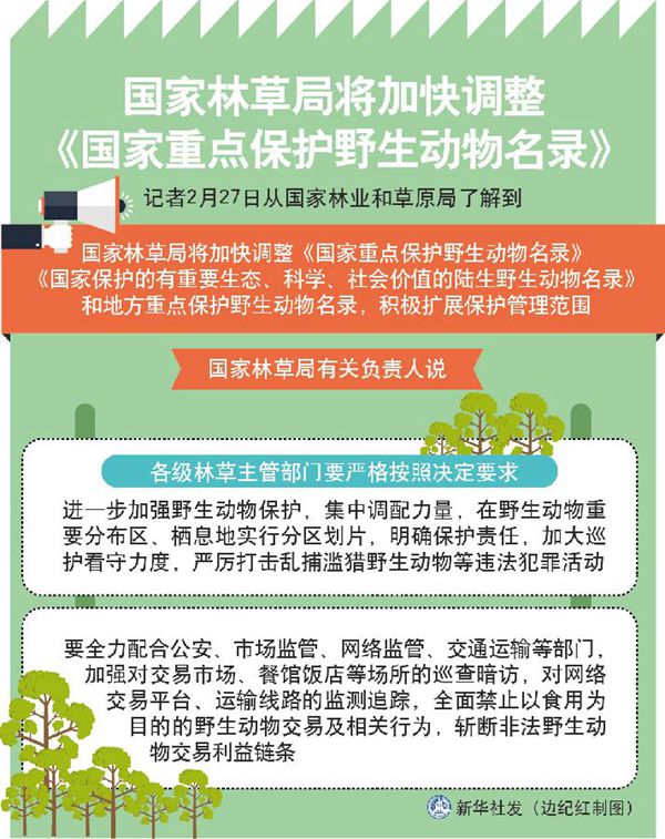 新華社北京2月27日電(記者胡璐)記者27日從國家林業(yè)和草原局了解到,國家林草局將加快調(diào)整《國家重點保護野生動物名錄》《國家保護的有重要生態(tài)、科學(xué)、社會價值的陸生野生動物名錄》和地方重點保護野生動物名錄,積極擴展保護管理范圍。