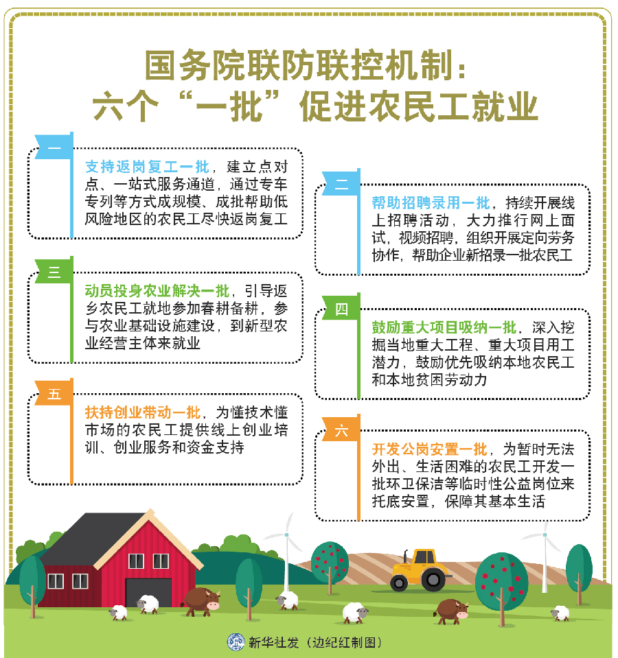 新華社北京2月28日電(記者王優玲、白瀛)在28日舉行的國務院聯防聯控機制新聞發布會上,人力資源社會保障部副部長游鈞說,總體看,此次疫情對農民工就業的影響比較大。在做好疫情防控的前提下,將通過六個“一批”來促進農民工就業。