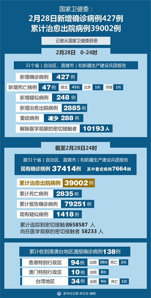 截至2月28日24時(shí),據(jù)31個(gè)省(自治區(qū)、直轄市)和新疆生產(chǎn)建設(shè)兵團(tuán)報(bào)告,現(xiàn)有確診病例37414例(其中重癥病例7664例),累計(jì)治愈出院病例39002例,累計(jì)死亡病例2835例,累計(jì)報(bào)告確診病例79251例,現(xiàn)有疑似病例1418例。累計(jì)追蹤到密切接觸者658587人,尚在醫(yī)學(xué)觀(guān)察的密切接觸者58233人。