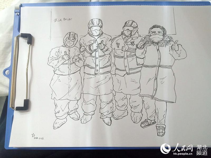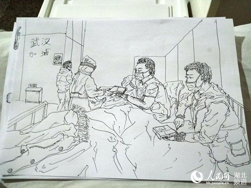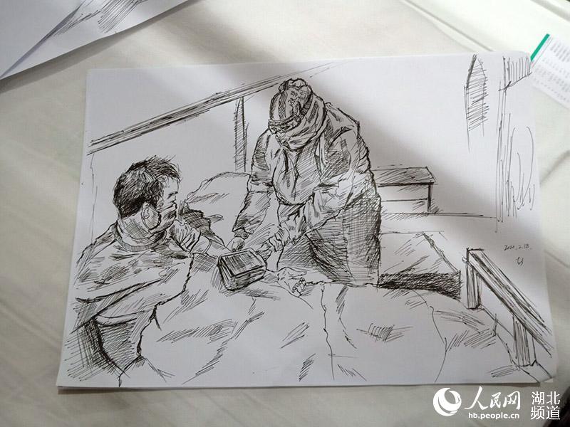 “被照顧得很好”的小彭常常看到醫(yī)護(hù)人員們穿著厚重的防護(hù)服,一忙就是6個(gè)小時(shí)以上不停歇,連水和飯都得換班以后吃,卻每天依然為患者提供無(wú)微不至的照顧。出于感動(dòng)和感激,彭昕燁向醫(yī)護(hù)人員借了紙和筆,將方艙醫(yī)院溫暖的瞬間畫(huà)成素描。