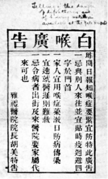 雅禮醫(yī)院院長(zhǎng)胡美簽發(fā)的預(yù)防白喉病的廣告
